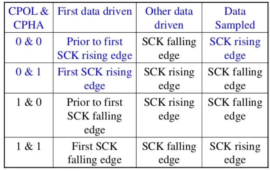 According to the values of these two bits, SPI communication can be in four modes given in this table.